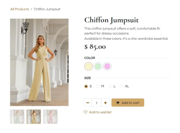 Configuración flexible para tus productos. La ropa viene en todas las formas y tallas. Configura tallas, colores y otras opciones en tu comercio electrónico para mostrar todas sus facetas.