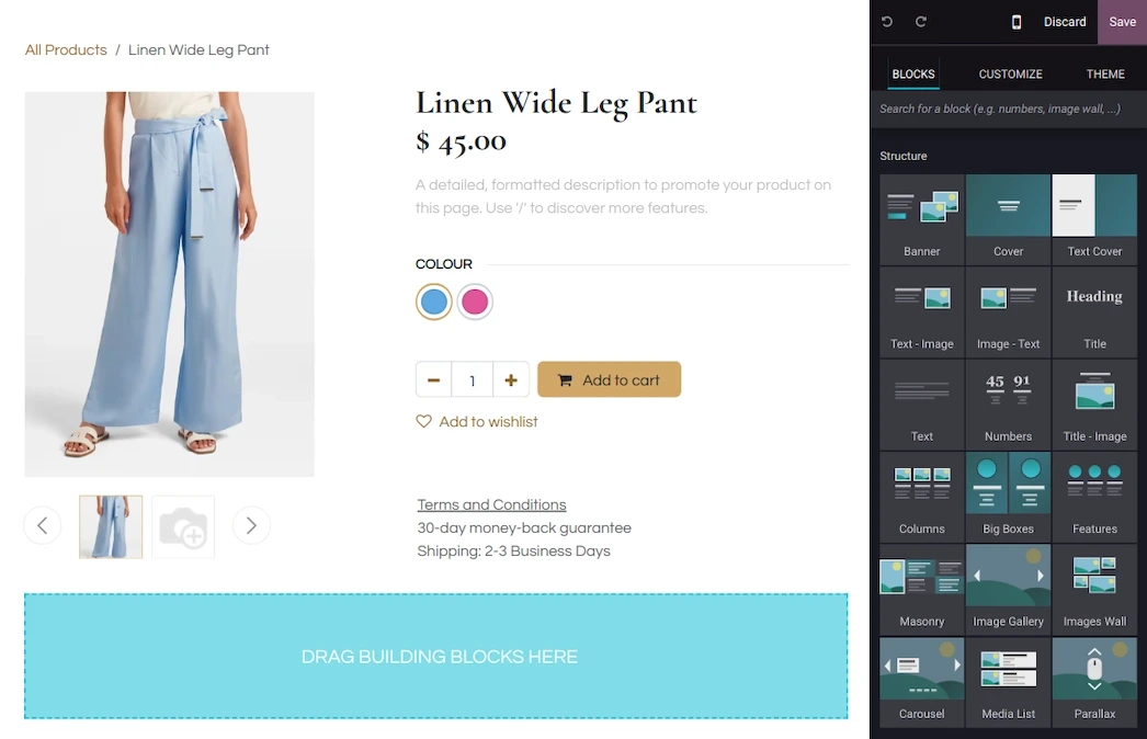 Arrastra y suelta bloques de creación. ¿Quieres cambiar algo específico del diseño de tu tienda en línea? ¿Agregar filtros o efectos a las imágenes? ¿Animar un elemento? No te preocupes, puedes hacer eso y más desde la página.